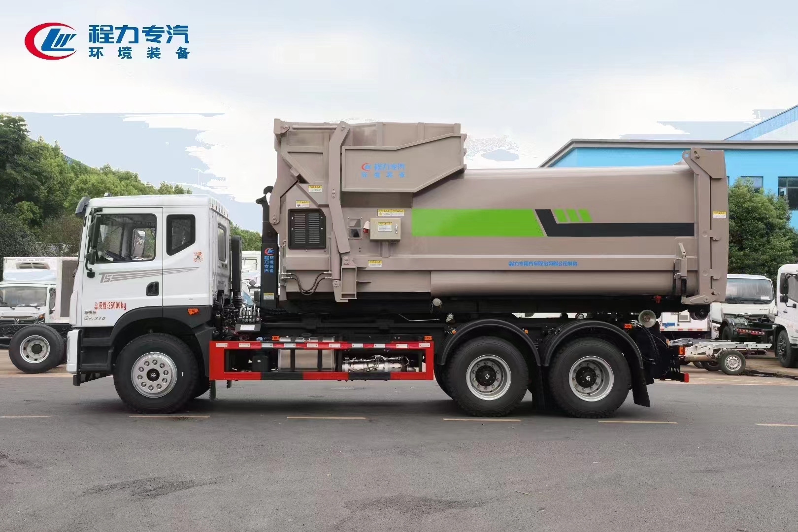 ??????湖北程力汽車:程力專汽東風(fēng)華神后雙橋勾臂垃圾車+移動壓縮箱產(chǎn)品型號及參數(shù)配置,程力專汽東風(fēng)華神后雙橋勾臂垃圾車+移動壓縮箱高清圖片,程力汽車系列程力專汽東風(fēng)華神后雙橋勾臂垃圾車+移動壓縮箱最新報(bào)價(jià)請撥打客服熱線。車輛主要配置 產(chǎn)品名稱: 程力威牌CLW5253ZXXBHJ車廂可卸式垃圾車 外形尺寸: 828025503170(mm) 排放水平: 國六 貨箱尺寸: (mm) 總質(zhì)量: 25000(Kg) 接近/離去角: 15/19,15/20,15/21() 額定質(zhì)量: 14250,14185(Kg) 前懸后...